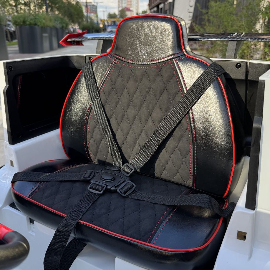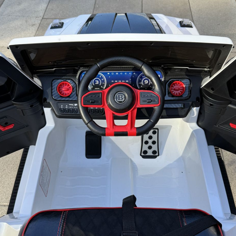 De G63 Brabus Rocket 900 XL onderscheidt zich ook door zijn luxueuze interieur. De verstelbare lederen zitplaats met een 5-puntsgordel bieden comfort en veiligheid op maat, terwijl carbon fiber details de sportieve en exclusieve uitstraling onderstrepen. Elk element, van de ergonomische bediening tot het materiaalgebruik, is zorgvuldig gekozen om een gevoel van kwaliteit en exclusiviteit te bieden dat ongeëvenaard is in deze categorie.