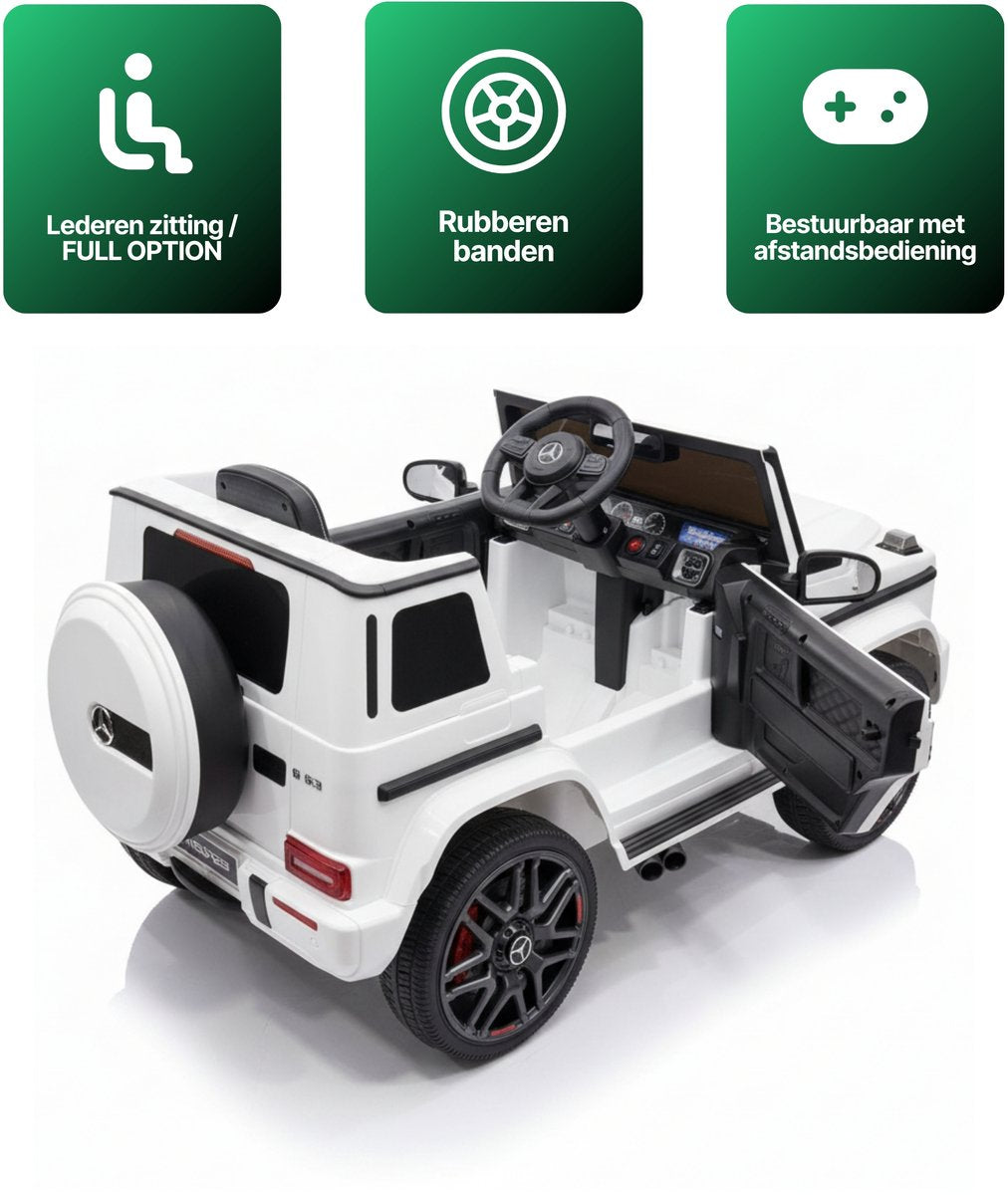 De Mercedes G63 AMG is de ideale kinderauto voor de kleine. De kids kunnen genieten als nooit tevoren met de nieuwe Mercedes G63 AMG. Het model is geïnspireerd op de originele Mercedes G63 AMG. Deze kinderauto is ideaal om thuis of buiten op verschillende soorten ondergronden te rijden. De Mercedes G63 AMG beschikt namelijk over echte rubberen banden. Dit zorgt voor comfort en betere rijgemak.