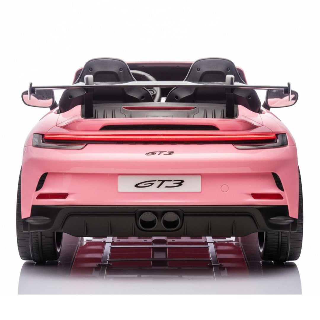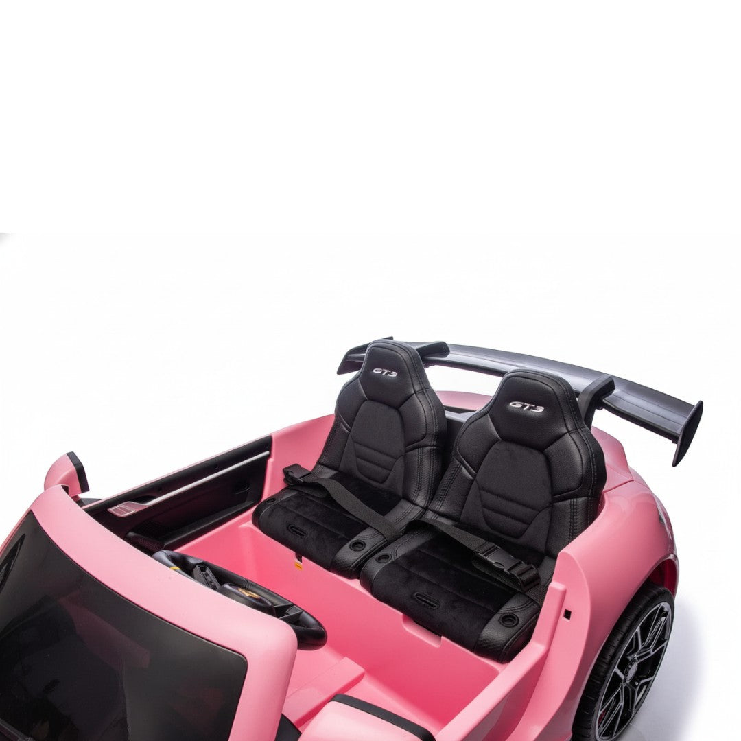 De Porsche 911 GT3 RS 24V is uitgerust met een dubbele leren stoel, voorzien van twee 3-puntsgordels, zodat beide kinderen veilig kunnen meerijden. Ouders behouden altijd de controle dankzij de draadloze afstandsbediening, waarmee je de auto eenvoudig kunt sturen, stoppen of van richting laten veranderen.